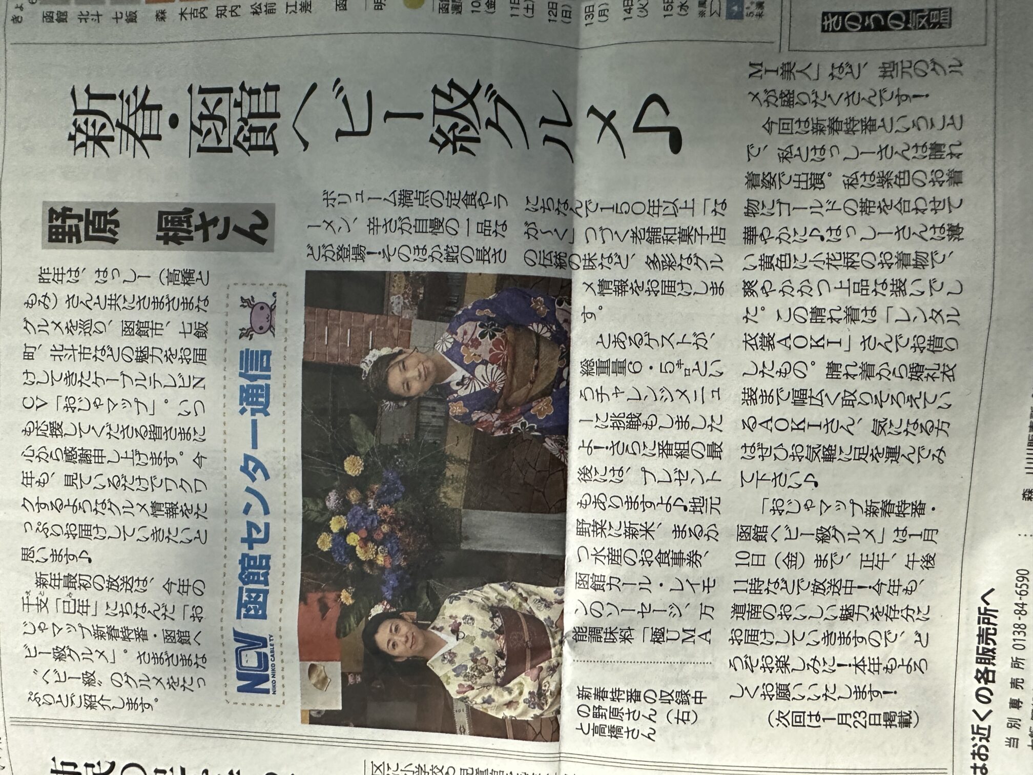 投稿日: 2025年1月10日2025年1月10日函館 レンタル衣裳 お正月 晴れ着 函館新聞に載せて頂きました! お正月番組で当店の着物を着ていただき、 NCVの高橋,野原様ありがとうございました。 とてもすてきです。